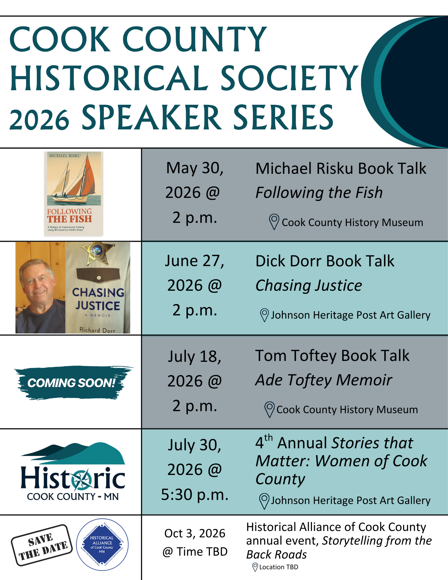 The Cook County Historical Society is pleased to announce its upcoming 2026 Speaker Series, featuring a diverse lineup of regional authors and local historians. This year’s series brings together stories of the North Shore’s commercial fishing traditions, firsthand accounts of law enforcement in rural America, and the cherished legacies of local families and influential Cook County women.