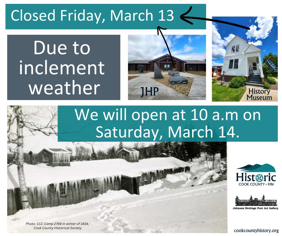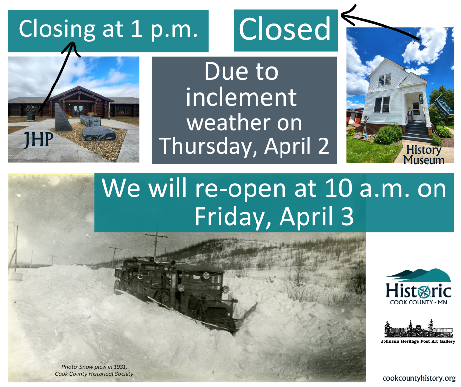The Cook County Historical Society is excited to announce our summer hours for the Cook County Historical Society History Museum, which begin on Friday, May 23. To celebrate, we will be hosting an open house and a new staff meet & greet on May 27, from 5 p.m. to 7 p.m.